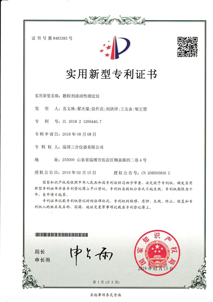 近日,我公司研發的《散粒劑流動性測定儀》已通過國家知識產權局的審批,獲得實用新型專利授權。這是繼《絕緣油恒溫取樣箱》取得專利之后,公司所獲得的又一項實用新型專利授權。